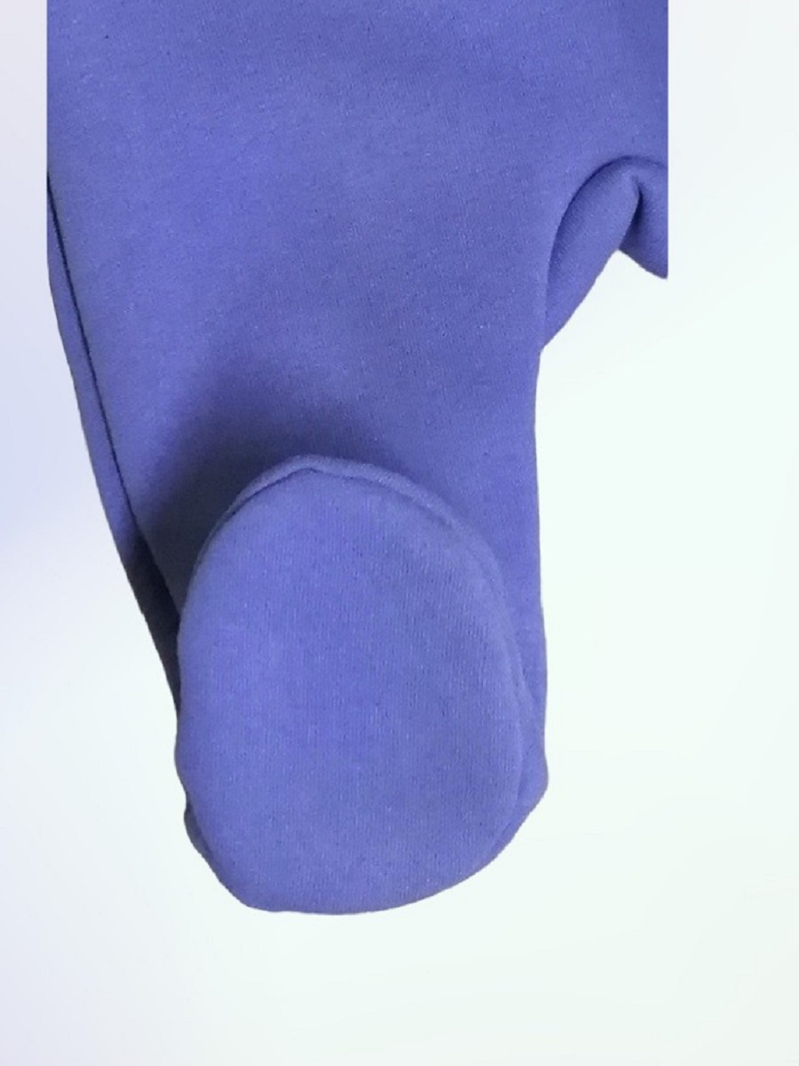Комбинезон с закрытыми ножками, с капюшоном на подкладке, молния по всей длине и до конца одной ножки.