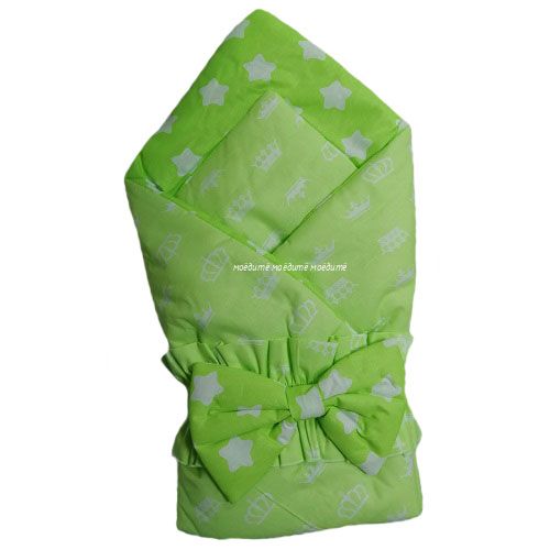 Одеяло выполнено из ткани с двумя разными рисунками, размер 100*100 см. Одеяло можно использовать для укутывания новорождённого, воспользовавшись для закрепления бантом на резинке, который идёт в комплекте.